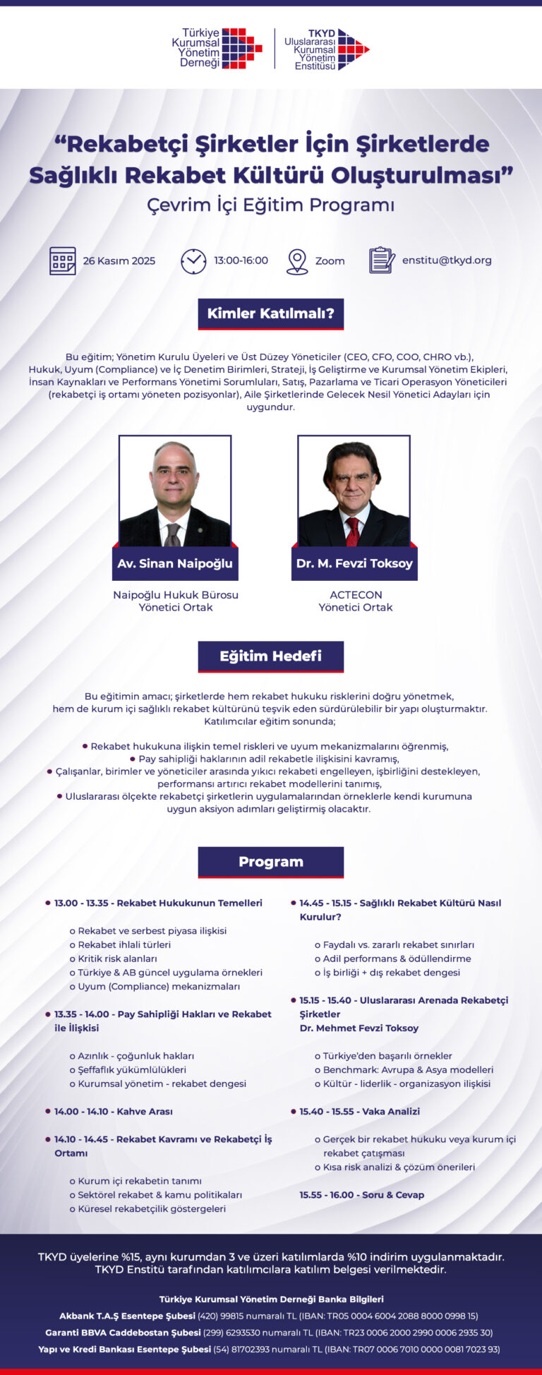 "Rekabetçi Şirketler İçin Şirketlerde Sağlıklı Rekabet Kültürü Oluşturulması" Çevrim İçi Eğitim Programı Genel Katılıma Açık Eğitim: "Ticari Defterlerin Elektronik Ortamda Tutulması" Uygulamalı Eğitim Programı Çevrim İçi Eğitim Programı "Holding ve Grup Şirketlerine Özgü Durumlar, Düzenlemeler ve Yaptırımlar" ESG Çalıştay Serisi Başlıyor! ESG-calistay Yönetim Kurulu Üyeliği Gelişim Programı Kış Dönemi Kayıtları Başladı! “KOBİ’lere Özel-Aile Şirketlerinin Sürdürülebilirliği için Kurumsal Yönetim ve Önemli Yatırım Enstrümanları” ESG Sertifika Programı 2. Dönem Duyurusu Eğitimler Arşivi Eğitim Takvimi