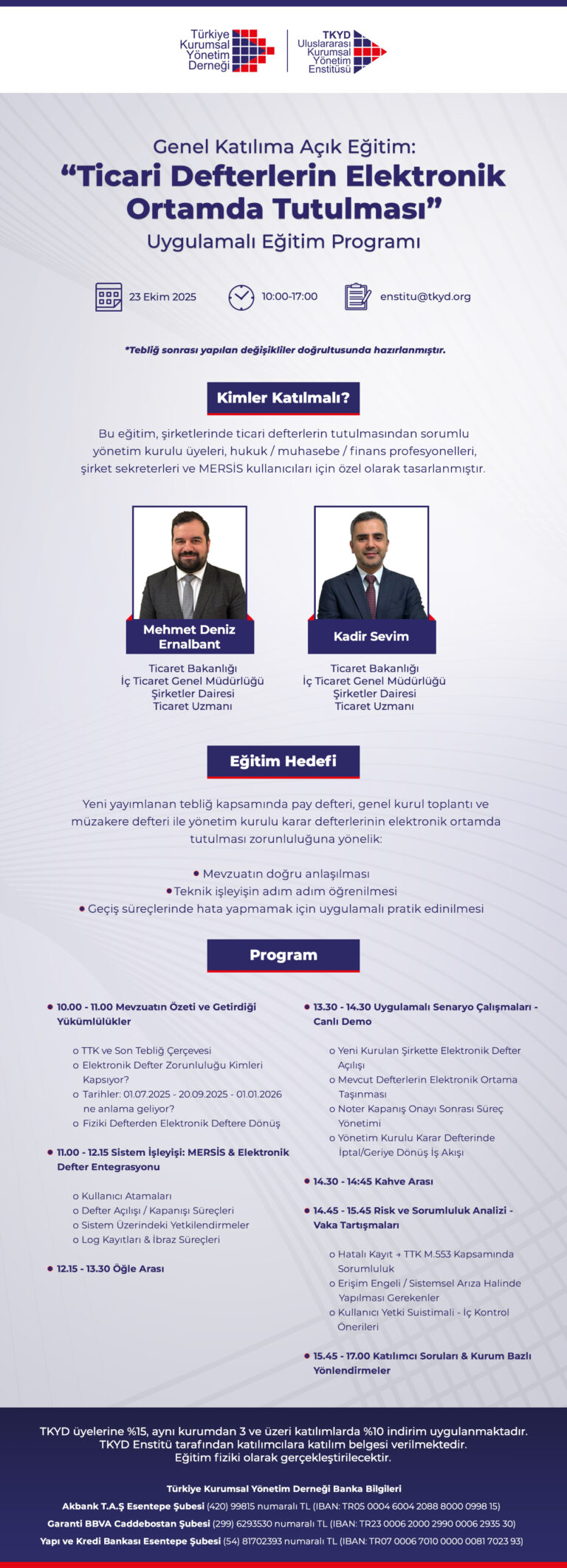Genel Katılıma Açık Eğitim: "Ticari Defterlerin Elektronik Ortamda Tutulması" Uygulamalı Eğitim Programı Çevrim İçi Eğitim Programı "Holding ve Grup Şirketlerine Özgü Durumlar, Düzenlemeler ve Yaptırımlar" ESG Çalıştay Serisi Başlıyor! ESG-calistay Yönetim Kurulu Üyeliği Gelişim Programı Kış Dönemi Kayıtları Başladı! “KOBİ’lere Özel-Aile Şirketlerinin Sürdürülebilirliği için Kurumsal Yönetim ve Önemli Yatırım Enstrümanları” ESG Sertifika Programı 2. Dönem Duyurusu Eğitimler Arşivi Eğitim Takvimi